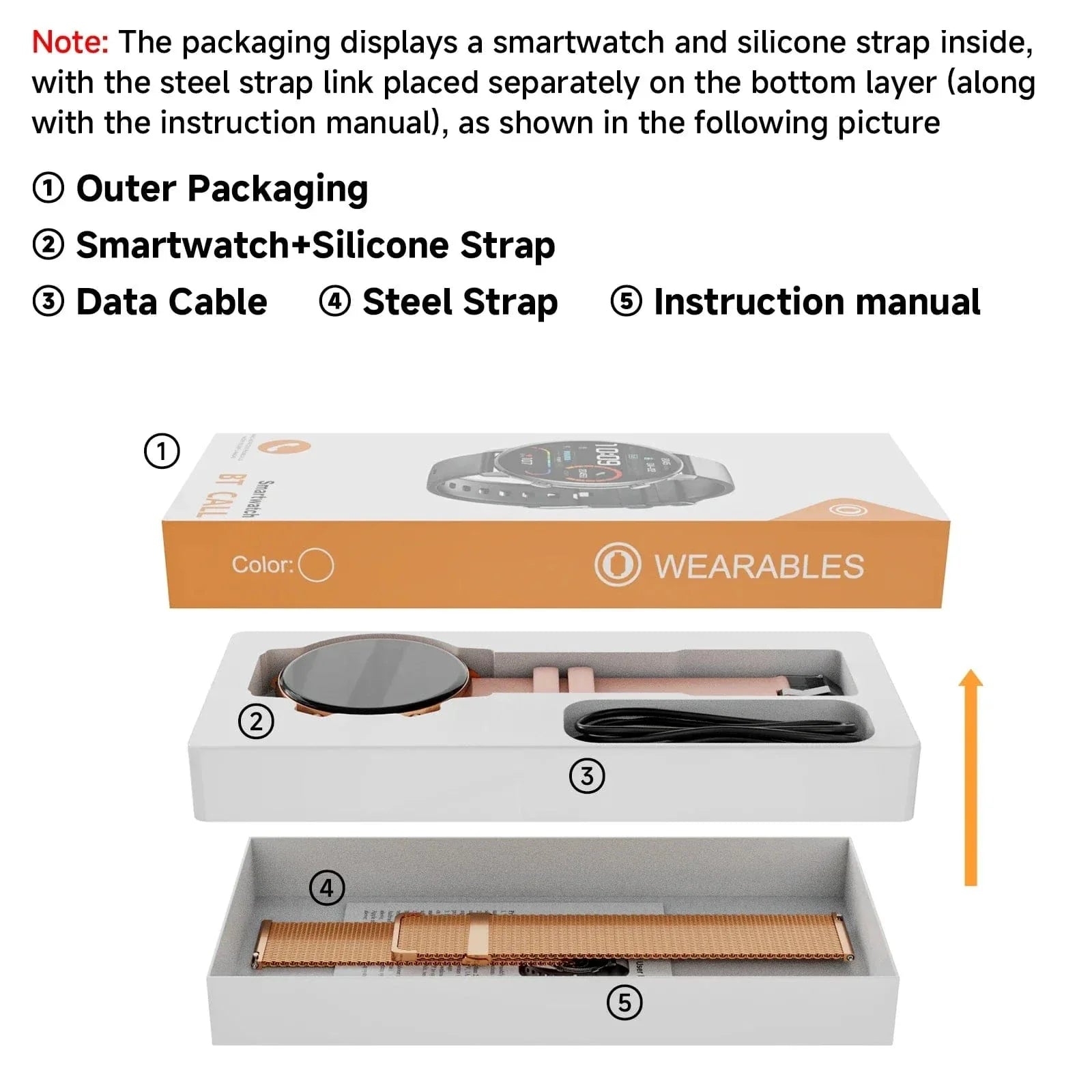 Relógio, carregador, pulseira, manual de instruções